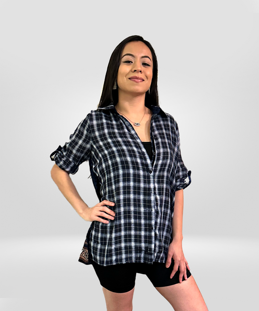 Blue Plaid Button-up with velvet and embroidered design.