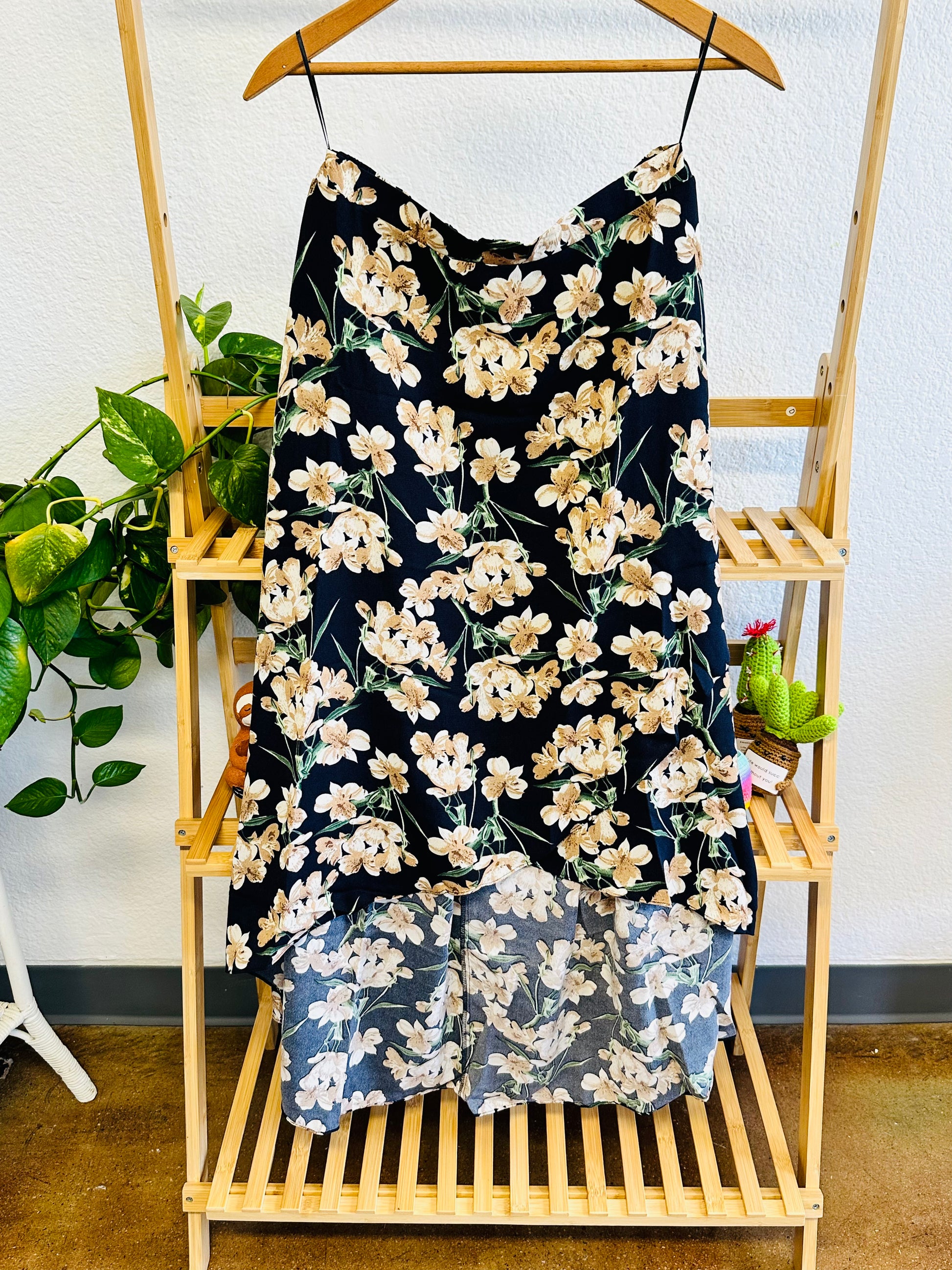 Comfortable high low skirt. Cute floral brown and black colors ready for fall! elastic back of the waist. light fabric.