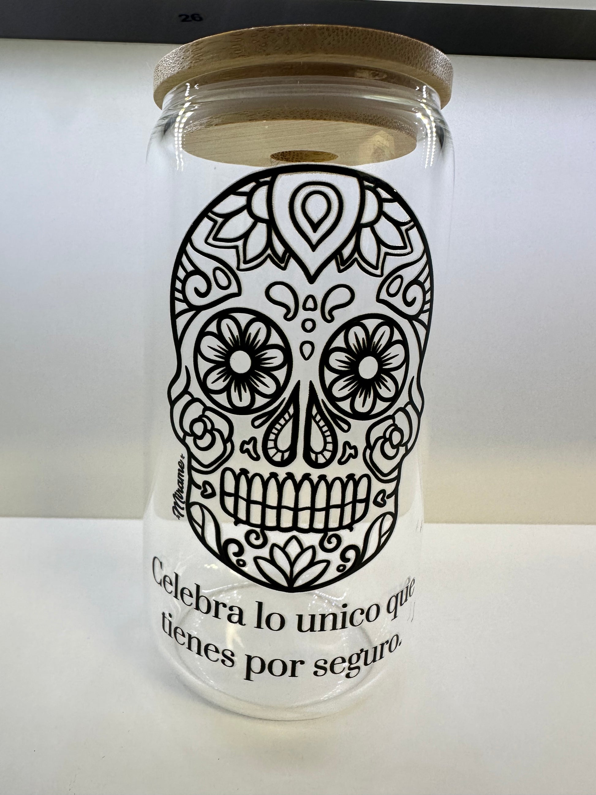 Glass cup with lid and "sugar skull design, Celebra lo unico que tienes por seguro" black