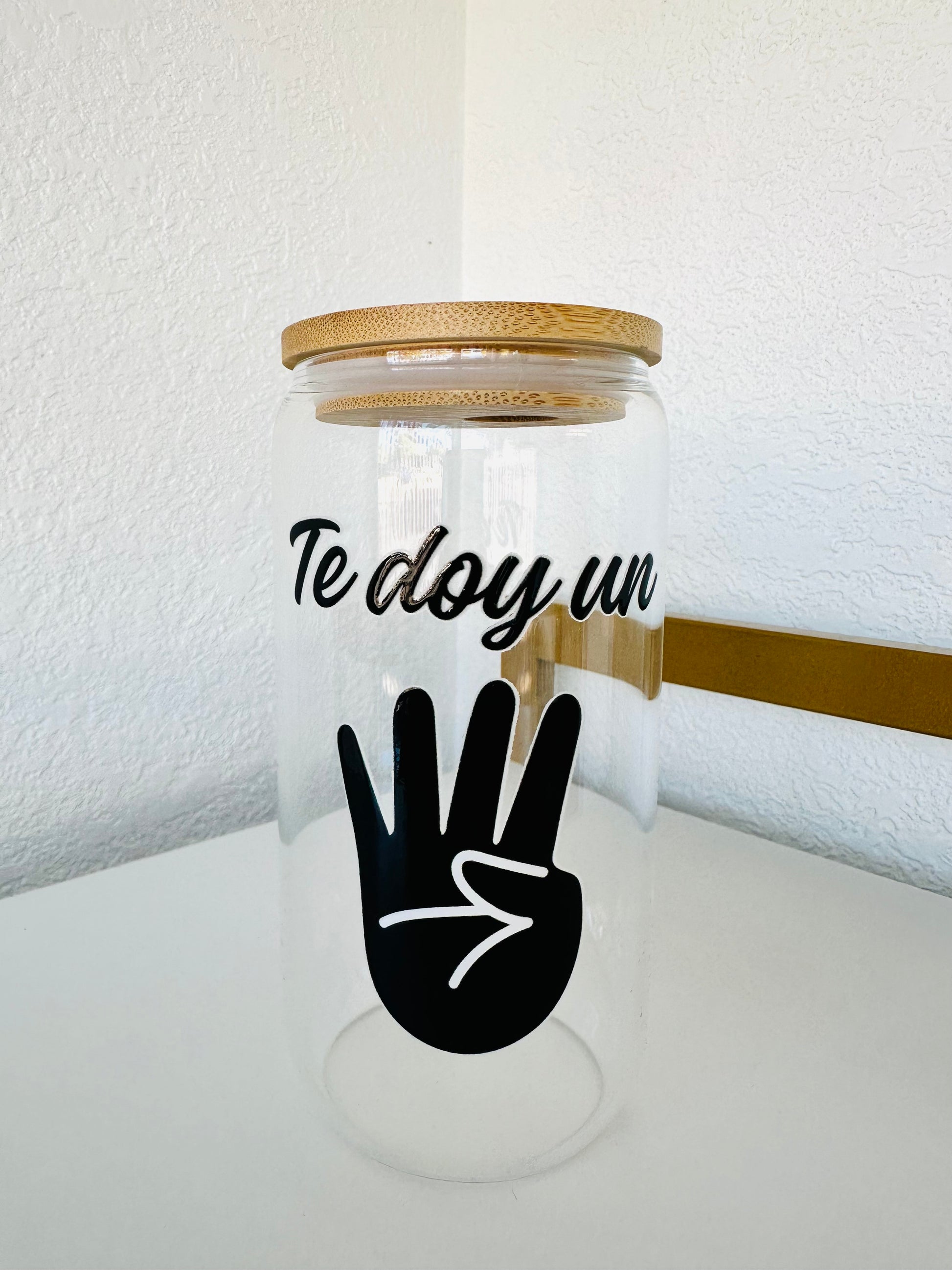 Glass cup with lid and "Te Doy Un 4 design"