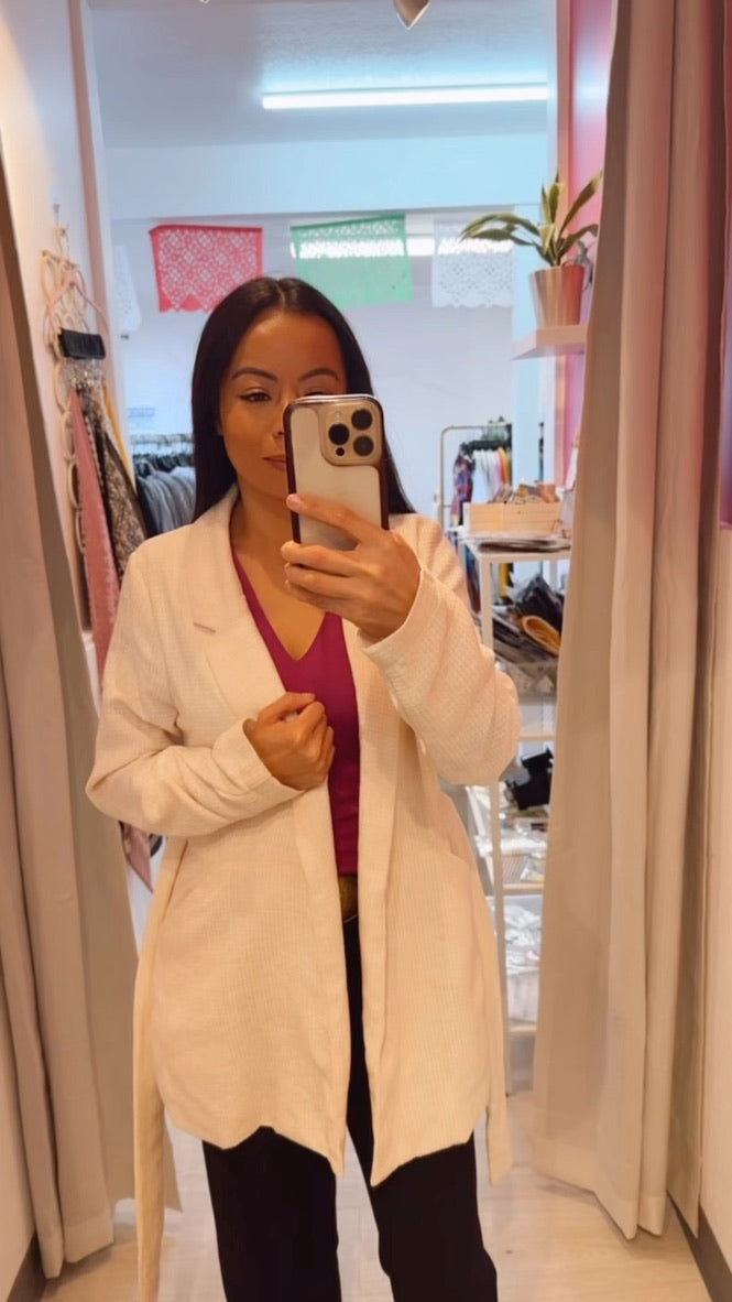 This off-white jacket or Blazer is ready to make your outfit pop! Long sleeves and belt closure give it a comfortable feel and fashionable look. The texture is a knitted waffle feel.