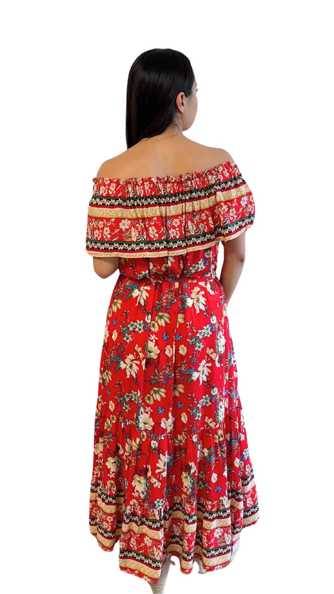 Red and Yellow Floral Printed Off Shoulder Maxi Dress