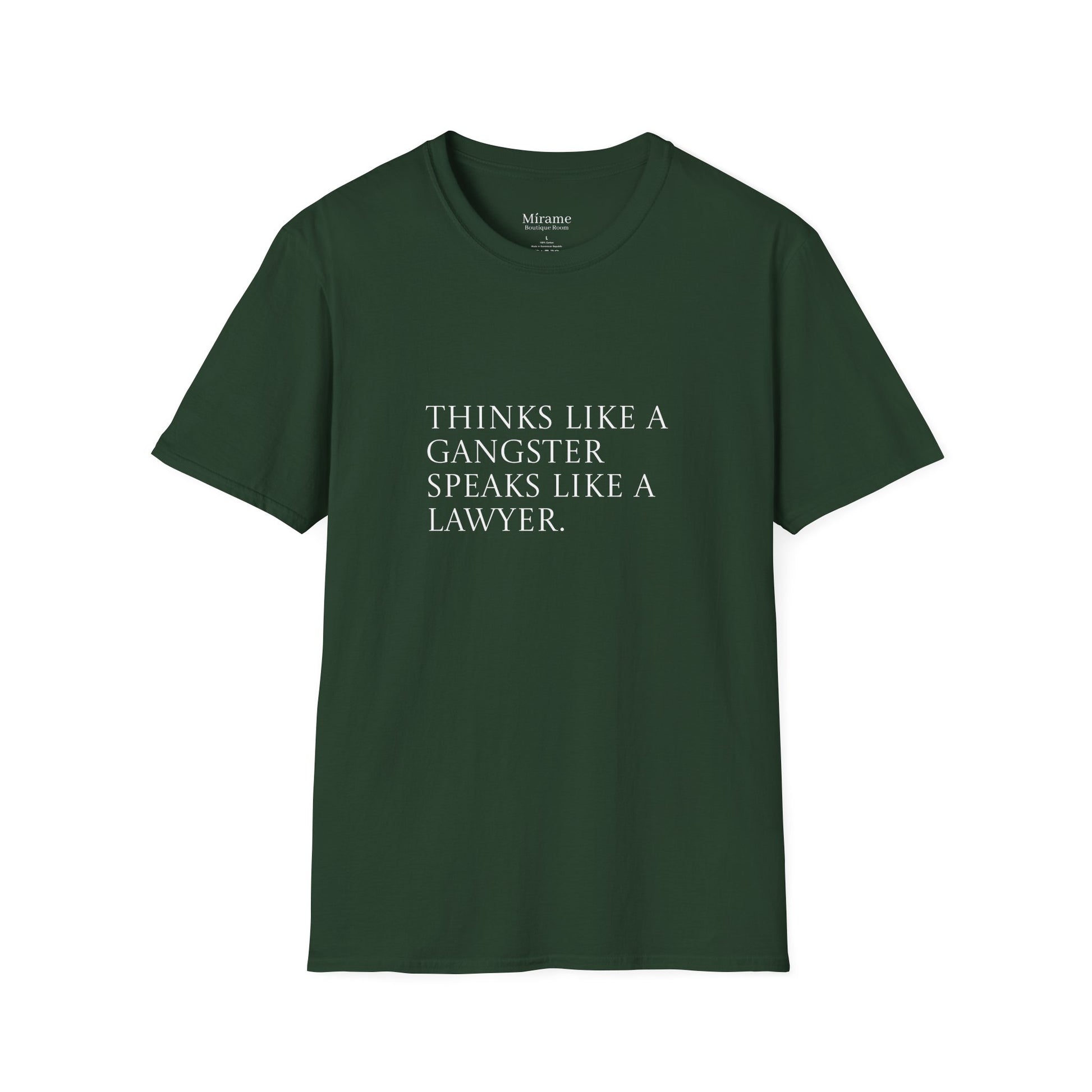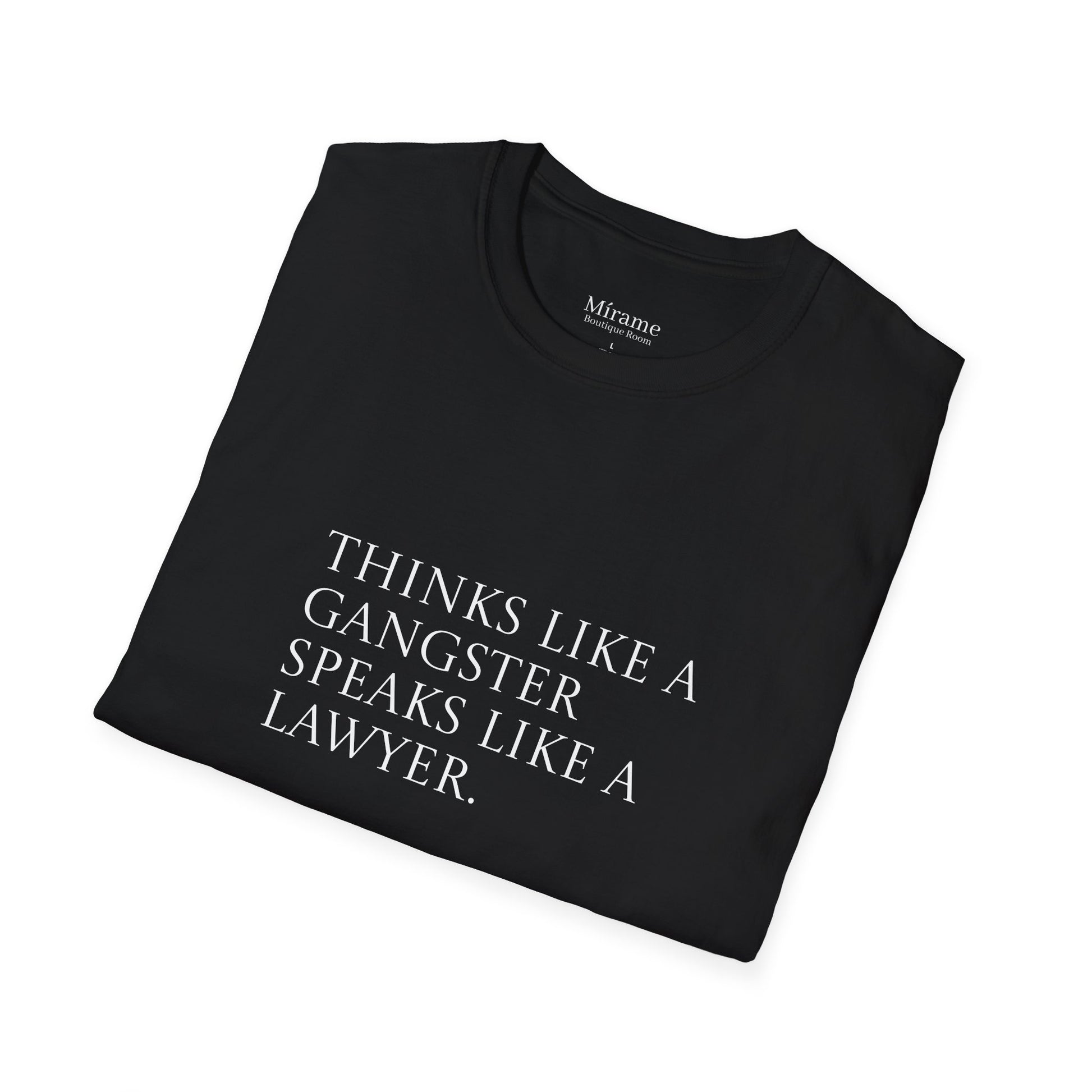 An inspiring unisex softstyle t-shirt featuring the quote 'think like a gangster speak like a lawyer'. This t-shirt is perfect for first-gen individuals looking to create generational wealth, offering a blend of inspiration and empowerment. It can be worn casually or dressed up for various occasions, making it a versatile addition to anyone's wardrobe. Ideal for adults, this t-shirt is made from durable and smooth fabric, ensuring comfort and style.