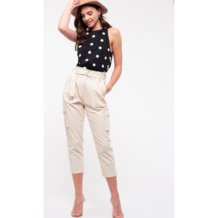 Black top with white pom pom dot or polka dot accents. Woven top with halter neck, sleeveless with neck wrapping straps and a back button-loop keyhole closure.