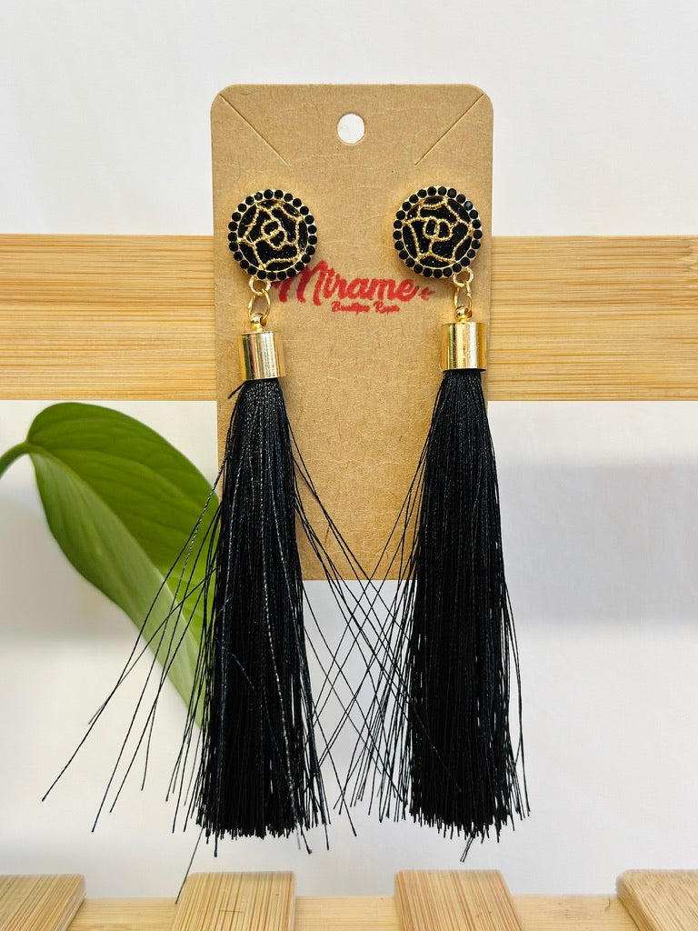 Tassel earrings with a golden rose detail and some rhinestones around it. 5" length including the stud.