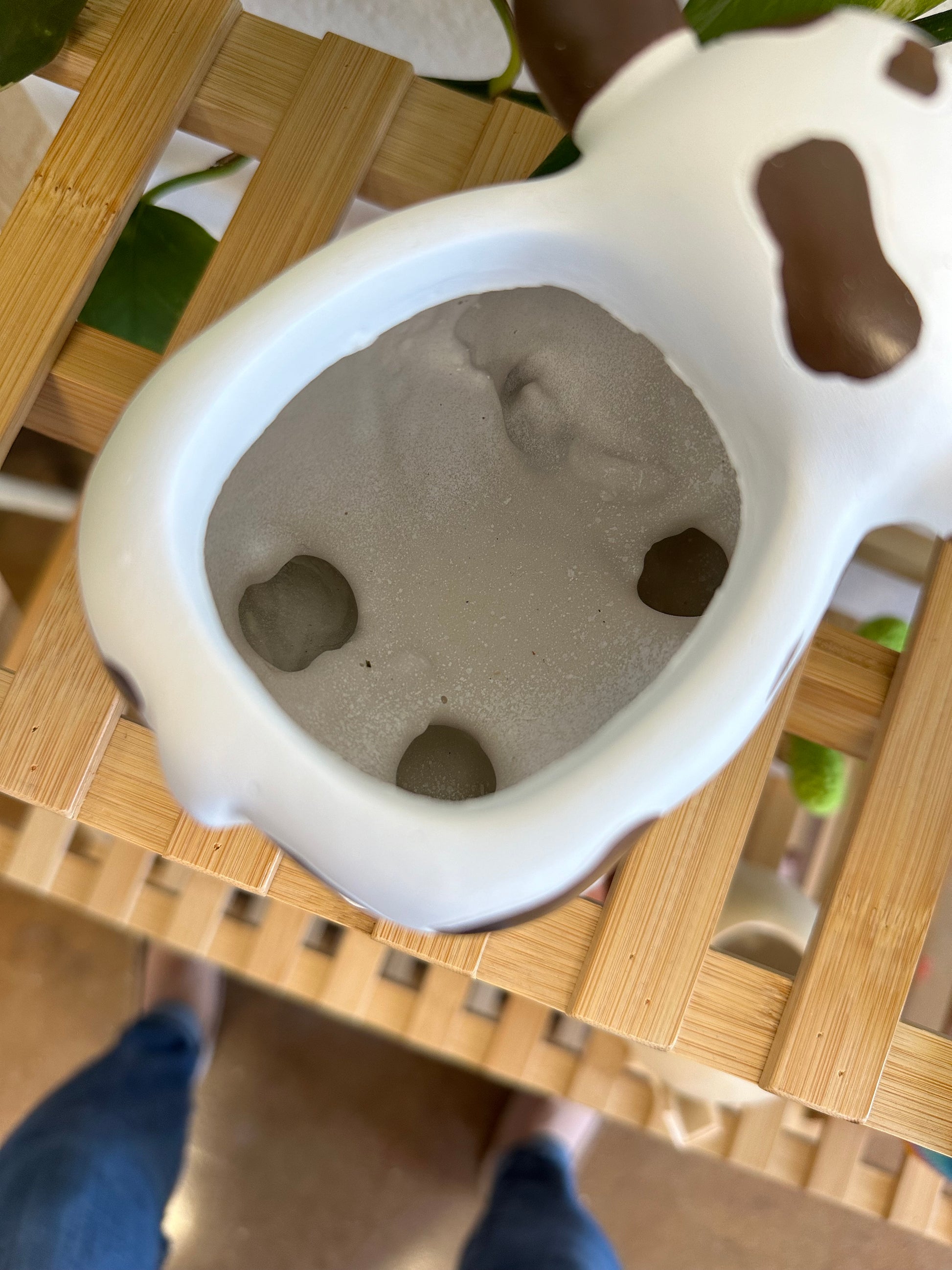 Planter in the shape of a cute cow with brown spots, ears and furry feet. Super cute gift for the smaller plants and succulents