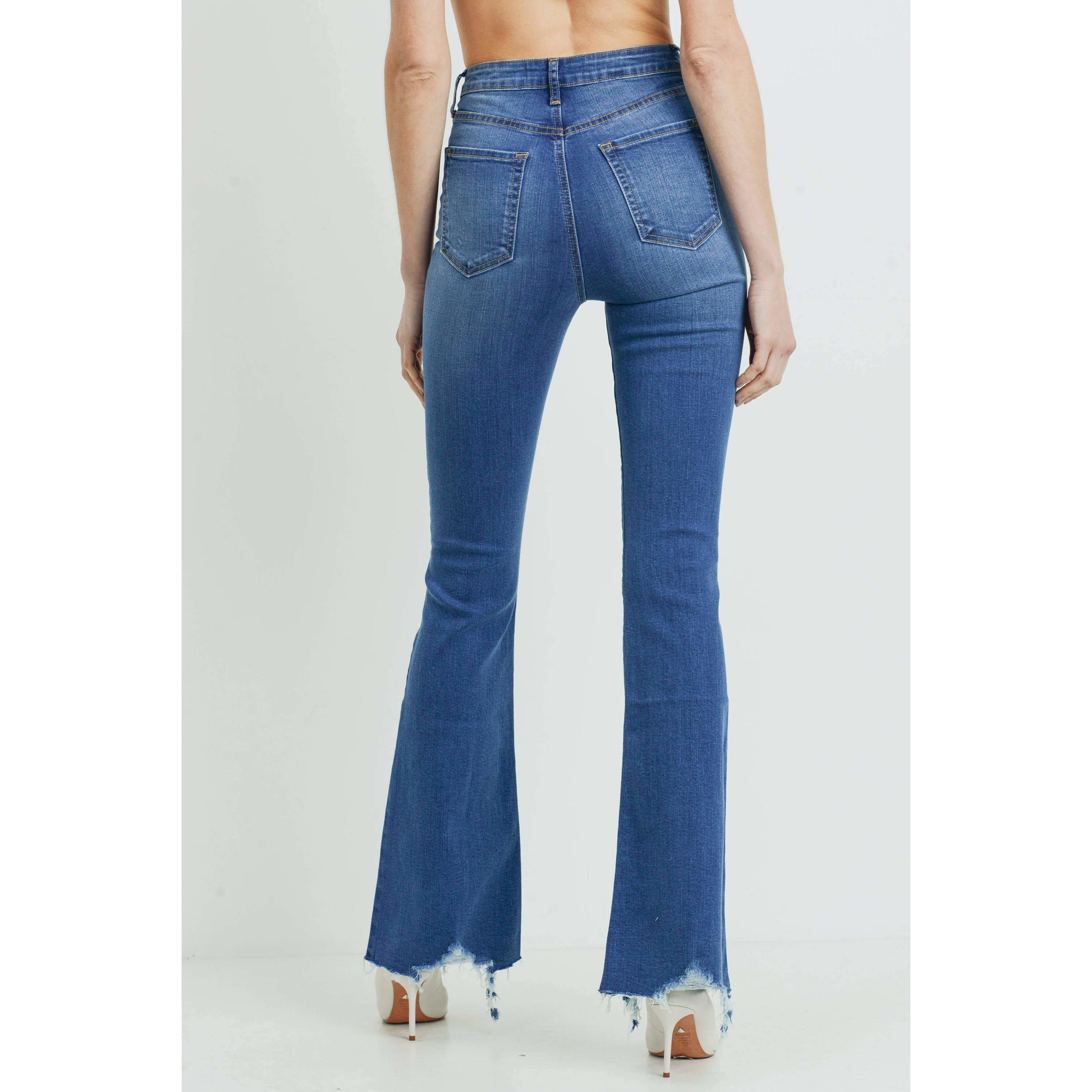 Just Black Denim Women's High Rise Flare Jeans with Ripped Hem Detail - Made in USA, Medium Wash (Style BP297J)