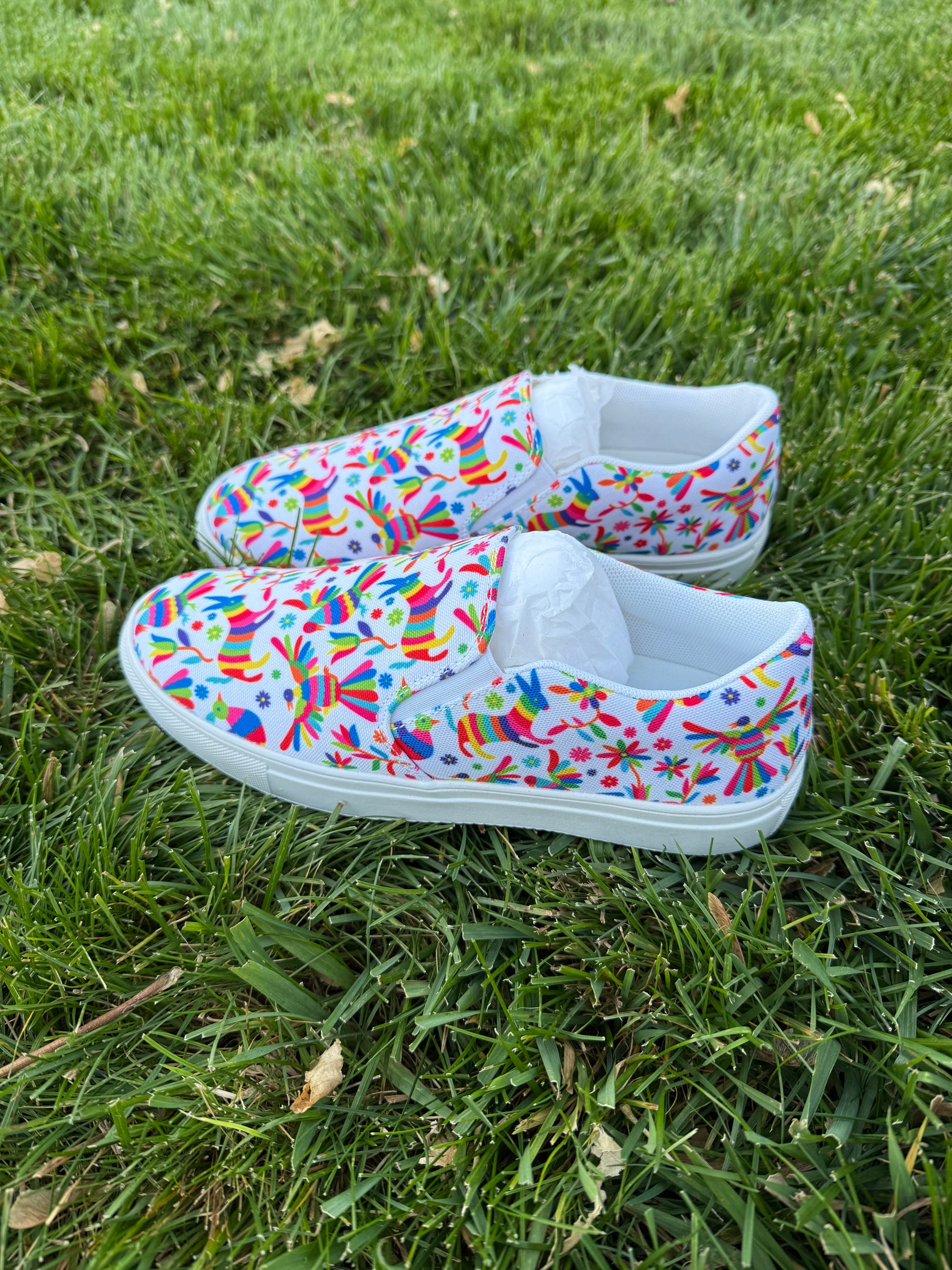Step into style with these charming slip-on canvas shoes featuring vibrant Otomi-inspired artwork. Perfect for everyday wear, they blend artistic flair with all-day comfort in a design that's as fun as it is functional. No laces, no fuss, just effortless style that celebrates traditional craftsmanship.