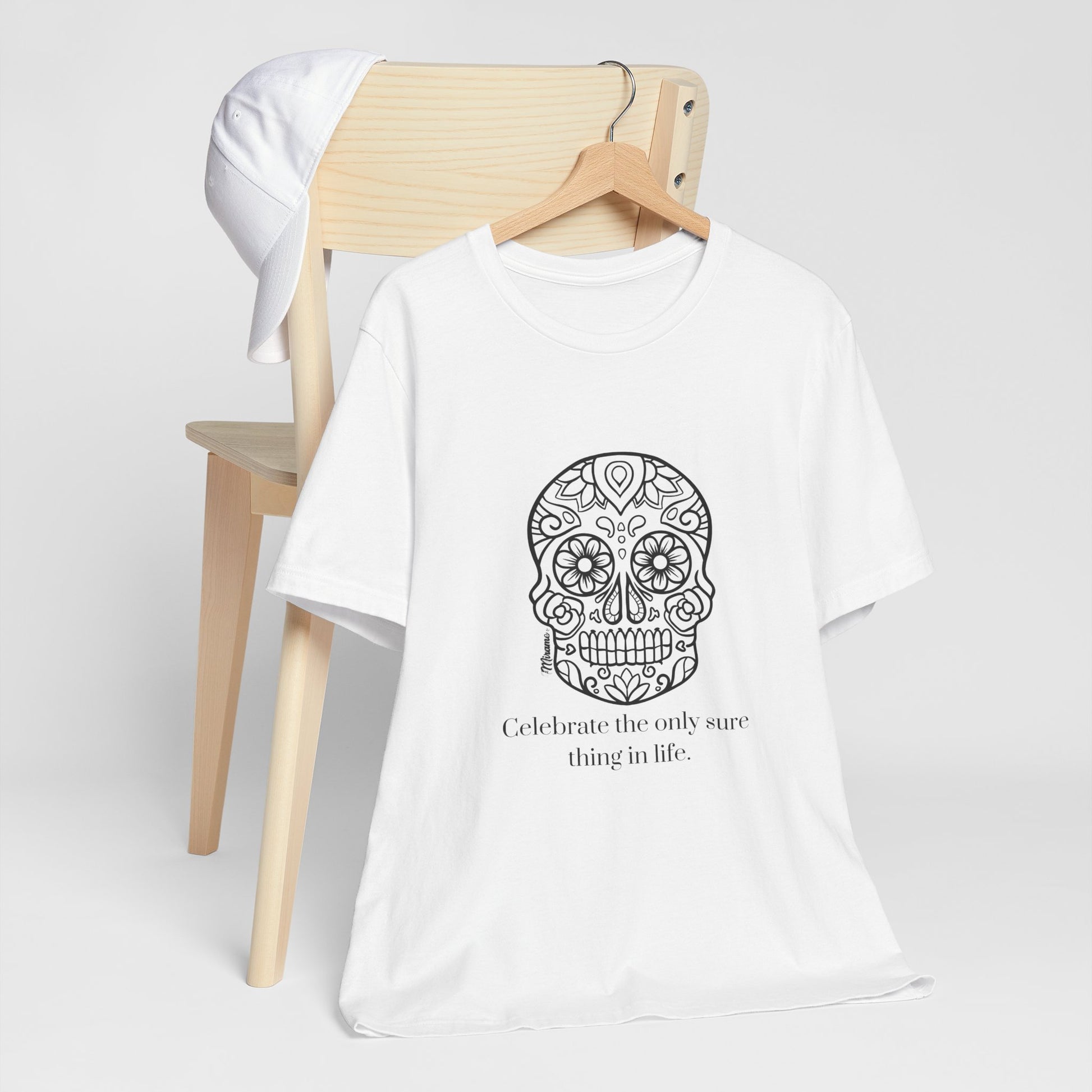 "Celebrate the only sure thing we have in life" tee with a skull graphic is a clean and simple yet deep message. We are often so focused on our day to day and routine that we forget that we also get to enjoy and play. We only live once after all and it is our choice to LIVE or not to LIVE day to day. Remind yourself and others of this when you wear this tee and Celebrate your life while you can because our loved ones will someday celebrate our death. Great for Dia de Los Muertos.